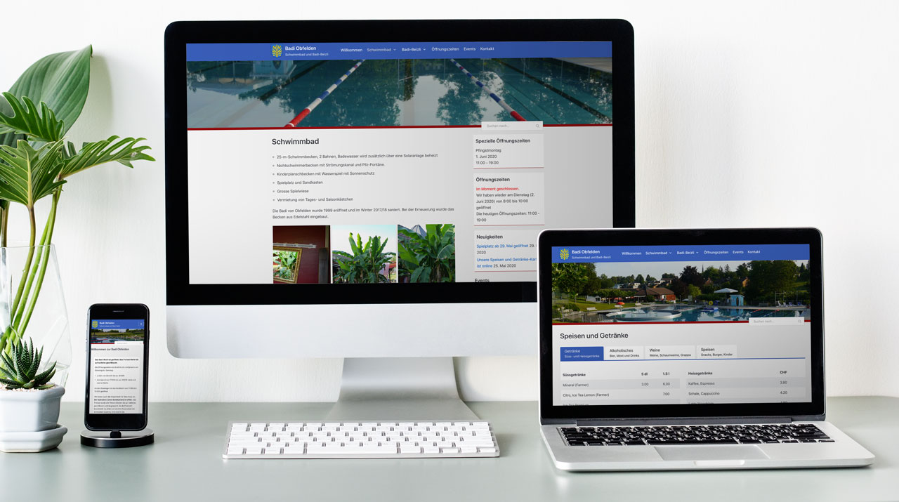 So startete das Projekt bereits Ende Sommer 2019 mit Fotoaufnahmen der Badi für die neue Webseite. Im März 2020 entstand dann innert einigen Tagen die ganze Webseite. Auf den Saisonstart hin wurden die Informationen aktualisiert. Unter dem Einfluss der Corona-Krise konnte das Schwimmbad noch nicht öffnen, aber umso wichtiger war jetzt die Webseite für die Kommunikation des Badi-Beizlis. Dieses ist seit dem Mai 2020 offen.
